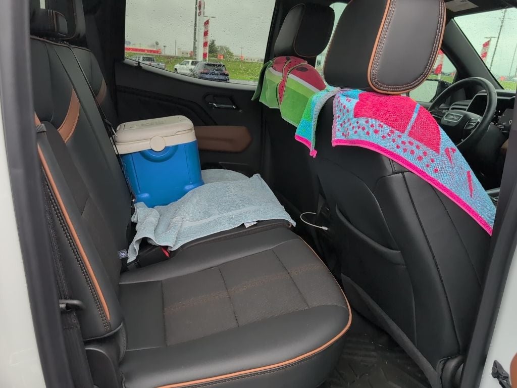 120-Volt Bed Mounted Power Outlet, 2 1st Row USB Charge/Data Ports, 2 Rear USB Ports in Center Console (Charge-Only), 3.42 Rear Axle Ratio, 4-Way Manual Front Passenger Seat Adjuster, 4-Wheel Disc Brakes, 6 Speakers, 6-Speaker Audio System Feature, 8-Way Power Driver Seat Adjuster, ABS brakes, Air Conditioning, Alloy wheels, AM/FM radio, Apple CarPlay/Android Auto, Auto High-beam Headlights, Auto-dimming Rear-View mirror, Automatic Emergency Braking, Automatic Stop/Start, Automatic temperature control, Blind Zone Steering Assist w/Trailering, Brake assist, Bumpers: body-color, Canyon Pro Safety, Canyon Safety Plus Package, Cloth/CoreTec Seat Trim, Compass, Delay-off headlights, Driver & Front Passenger Illuminated Visors, Driver door bin, Driver Mode Selector, Driver vanity mirror, Dual front impact airbags, Dual front side impact airbags, Dual-Zone Auto Climate Control Air Conditioning, Electronic Stability Control, Emergency communication system: OnStar, EZ-Lift & Lower Tailgate, Following Distance Indicator, Forward Collision Alert, Front anti-roll bar, Front Bucket Seats, Front Center Armrest, Front dual zone A/C, Front fog lights, Front LED Fog Lamps, Front License Plate Kit, Front Passenger Seatback Map Pocket, Front Pedestrian & Bicyclist Braking, Front reading lights, Front wheel independent suspension, Heated door mirrors, Heated Driver & Front Passenger Seats, Heated front seats, Illuminated entry, Inside Rear-View Auto-Dimming Mirror, Integrated Trailer Brake Controller, IntelliBeam Automatic High Beam On/Off, Interior Overhead Courtesy Light w/Dual Reading Lamp, Lane Keep Assist w/Lane Departure Warning, Low tire pressure warning, MultiStow Tailgate Storage Compartment, Navigation System, Occupant sensing airbag, Off-Road Suspension, Outside temperature display, Overhead airbag, Overhead console, Panic alarm, Passenger door bin, Passenger vanity mirror, Power door mirrors, Power Driver Lumbar Control Seat Adjuster, Power driver seat, Power steering, Power windows, Preferred Equipment Group 4SG, Radio data system, Radio: 11.3 Diagonal Premium GMC Infotainment Sys, Rear Cross Traffic Braking, Rear of Console 120-Volt Power Outlet, Rear reading lights, Rear step bumper, Rear window defroster, Remote keyless entry, Remote Vehicle Starter System, Security system, SiriusXM w/360L, Speed control, Speed-sensing steering, Split folding rear seat, Spray-On Bedliner w/GMC Logo, Steering wheel mounted audio controls, Stop/Start System Disable Button Engine Control, Tachometer, Tailgate Keyed Cylinder Lock, Telescoping steering wheel, Tilt & Telescopic Manual Steering Column, Tilt steering wheel, Traction control, Trip computer, Ultrasonic Rear Park Assist, Variably intermittent wipers, Wheels: 18 x 8.5 Dark Gray Machined Finish Alum, Wireless Apple CarPlay/Wireless Android Auto.